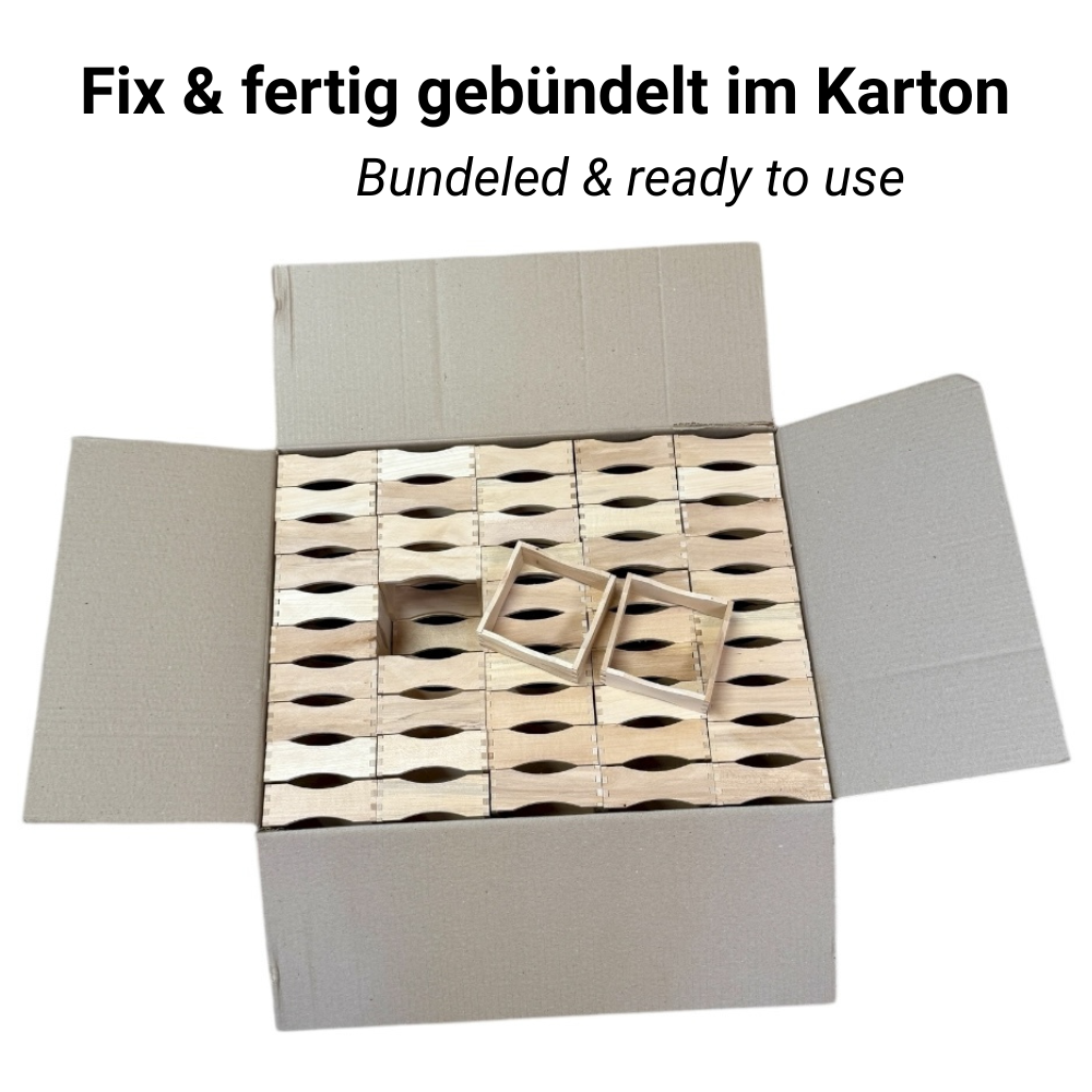 100 Stück Holz-Rähmchen (Lindenholz) fertig gebaut, Abmessungen: 100 × 100 × 37 mm (L × B × H). Lieferung ohne Wachsanfangstreifen, und ohne Honigwabe.
