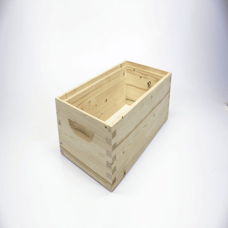 Zargen aus Fichtenholz 24mm wasserfest stabverleimt, Eckverbindung in Fingerzinken Ausführung. Oben auf der Innenseite herum ein 14 mm Rähmchen Auflagefalz, auf der Unterseite ein 3mm Rutschfalz. Zwei ergonomische Griffmulden Einfräsungen vorne und hinten. Alles fertig gebaut und geschliffen. Gewicht: 2,6 kg download Gebrauchsanweisung Zander und EHM